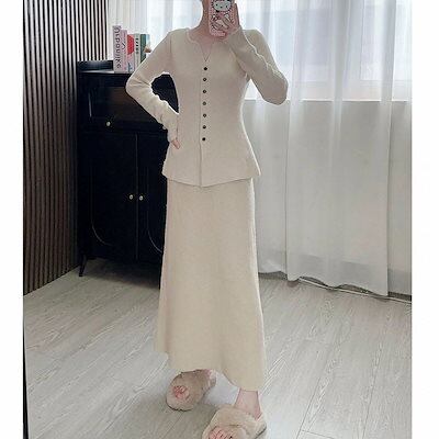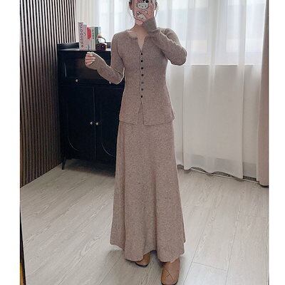 ウエスト引き締め ニットスカート シンプル 新作 【2枚購入で 気質 レディースセットアップ セットアップ 上下セット Vネック セーター 2oo円OFF!】秋冬 百掛け