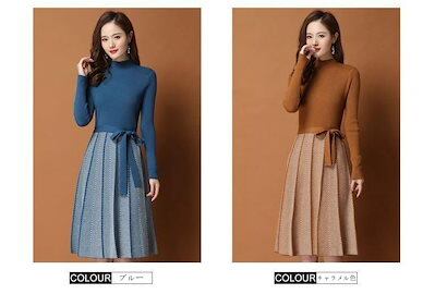 ニットワンピース レディース ベーシックニット 秋冬 きれいめ 膝丈ワンピース 長袖 リボン Aラインプリーツスカート ニット 結婚式ドレス 通勤 ロング 着痩せ オシャレ