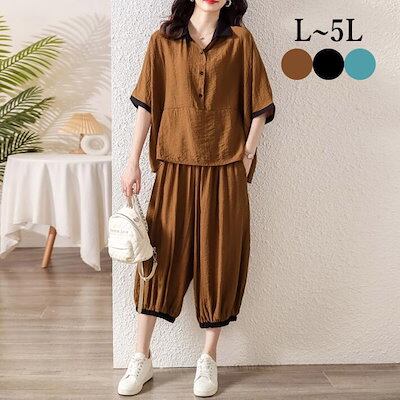 2点セット セットアップ トップス ボトムス ブラウス パンツ サーカスパンツ ボリュームパンツ サルエルパンツ フィッシュテール ウエストゴム 半袖 レディース 楽チン 大きいサイズ 夏