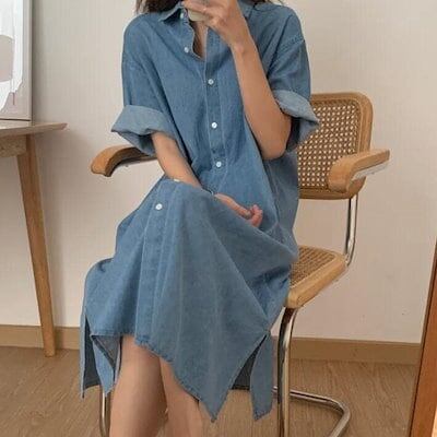 ワンピース シャツワンピース  ロングシャツ オーバーサイズ 羽織り デニム風 レディース ロング 半袖 大きいサイズ スリット ゆったり カジュアル 夏