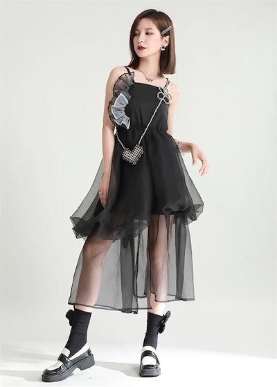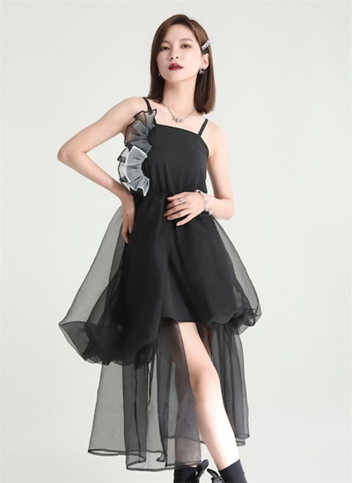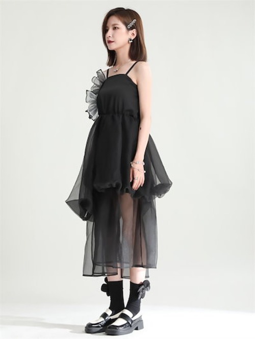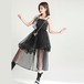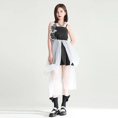 【J.Fashion】 Aライン キャミワンピース レイヤード 夏 ニセ2セット チュールスカート レディースワンピース 着痩せ ロングワンピース ドレス メガ割