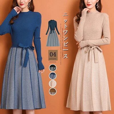 ニットワンピース 長袖 リボン 秋冬 きれいめ 通勤 Aラインプリーツスカート 着痩せ オシャレ 膝丈ワンピース30/40代 結婚式ドレス ニット レディース ロング