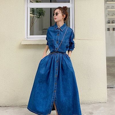 デニムロングワンピース デニム デニムワンピース 長袖/七分/五分袖 きれいめ レディース 春 夏 秋 ロング デニムワンピ サロペット大きいサイズ マキシ丈 Aライン ポケット付き 大人