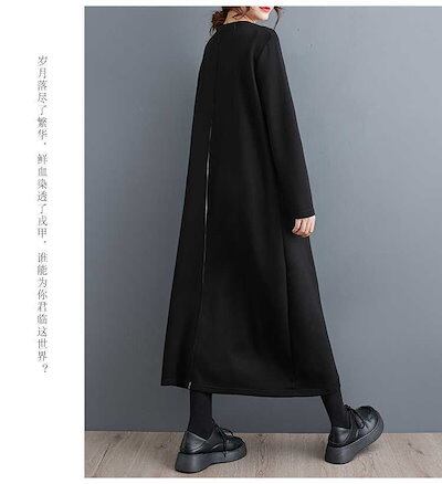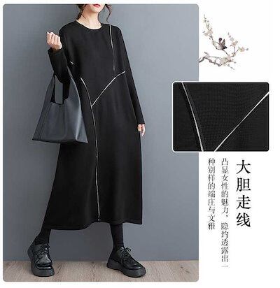 「ファットガール」 2023秋 黒ワンピース 後ファスナー ロング丈 ドッキング ゆったり Aライン レディース ジッパー ロングワンピース メガ割