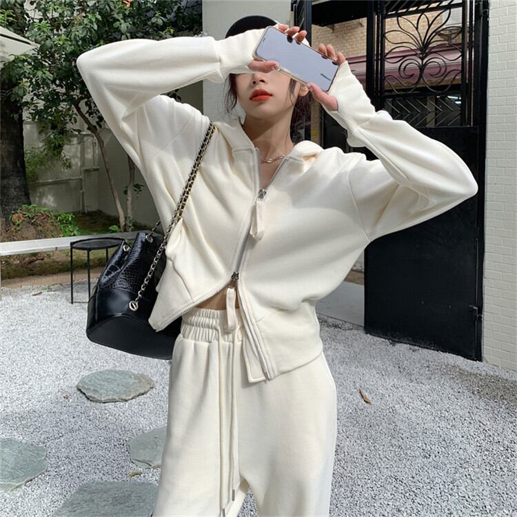 体型カバーに効くダブルジッパーフード付きバーカーコート+ドローストリング スウェットパンツ