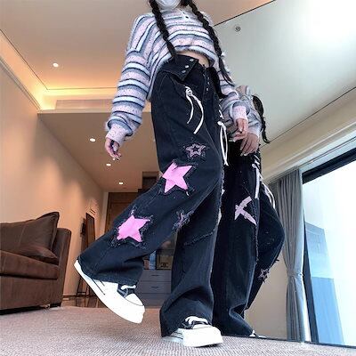 ジーンズ リアル ストリート ワイドパンツ ジーンズ レディース ハイウエスト ワイドパンツ スター デザイン サブカルチャー パンツ ?国ファッション