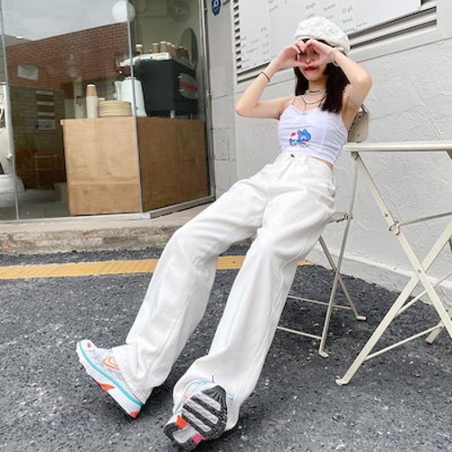 ホワイト ワイドパンツ デニムパンツ レディース 春 新商品 ハイウェスト 着 痩せ ゆったり エクストラログ丈 ストレートパンツ モップパンツ