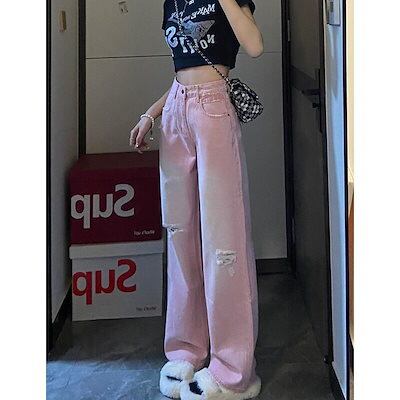デニムボトムス グラーデション 穴をあけるジーンズ レディース ニューデザイン ハイウェスト 着痩せ ワイドパンツ モップパンツ