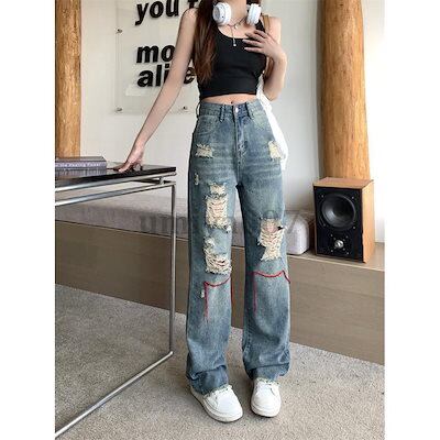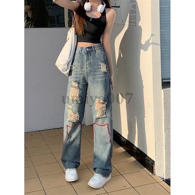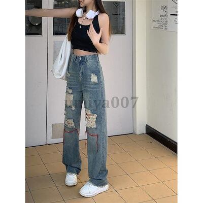 ワイドパンツデニム ダメージ加工 レディース ゆったり ボトムス ジーンズ ハイウエスト おしゃれ ジーパン 着やせ ロングパンツ