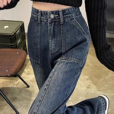 デニムパンツ ロングパンツ ワイド バギー ポケット ストレート レディース 韓国ファッション シンプル 大きいサイズ XXL 体型カバー シンプル