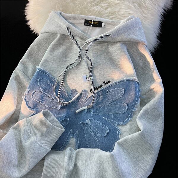 2024秋冬韓国ファッション異素材デニム蝶柄長袖パーカースウェット