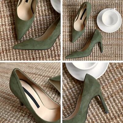 メガ割 パンプス 靴 レディース ポインテッドトゥ 浅め スウェード ハイヒール ピンヒール オフィス 通勤 L 黒 青 グリーン ピンク イエロー 韓国