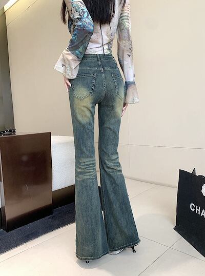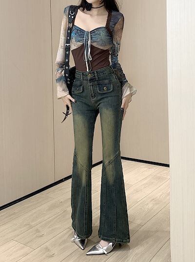 2024春夏 アメリカン パンツ デニム ブルー ジーンズ ロング丈 スキニー レッグ加工 ハイウエスト 脚長効果 美脚効果 細見え 秋 カジュアル 韓国ファッション お出かけ
