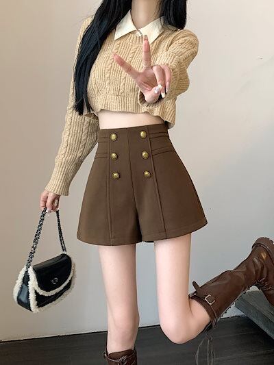 2024秋冬 防寒 あったか 厚手ウール生地パンツショート丈ストレートハイウエストゆったり 脚長美脚細見え春カジュアル黒白韓国系ファッションレディースおしゃれ かわいい衣装トラック