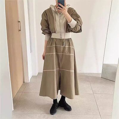 ワンピース レディース ロング 秋 春 配色 パーカー ジップ 長袖 ロング丈 ロング丈ワンピース シャツワンピース フレアワンピース 大きサイズ ゆったり 体型カバー 痩せる効果 aライン ギャザー