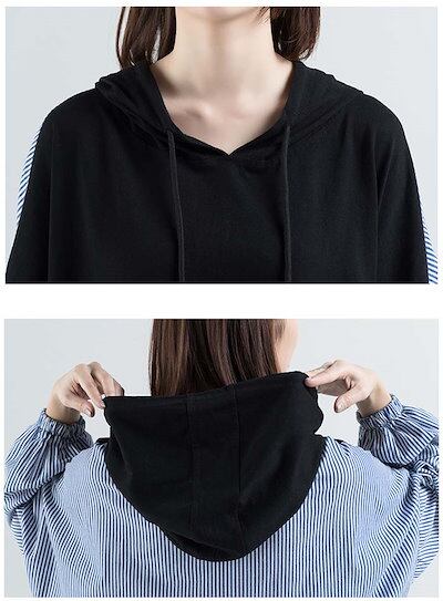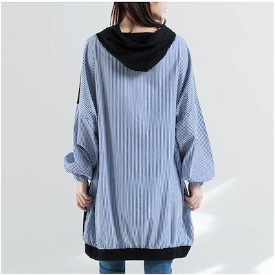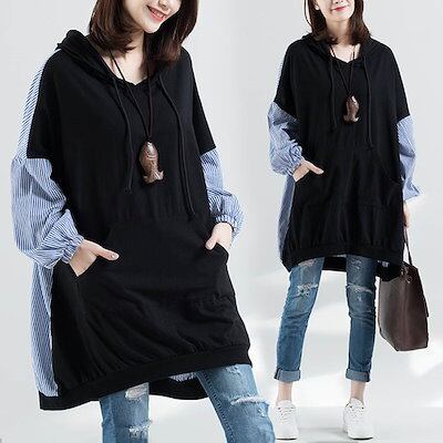 パーカー レディース 異素材 切り替え ストライプ ロング丈 大きめ ドロップショルダー ゆったり 大きいサイズ レディース 秋冬 春 トップス 長袖 おしゃれ カジュアル ロングパーカー プルオーバ