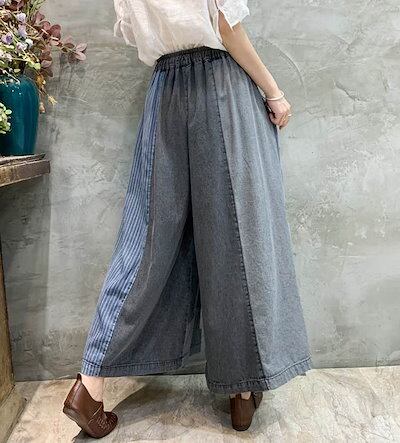 デニムワイドパンツ レディース デニムパンツ ワイドパンツ 切り替え 配色 ロングパンツ ウエストゴム ボトムス カジュアル 大きいサイズ 大人 楽ちん 美脚 ゆったり デニム 幅広い エレガント 体