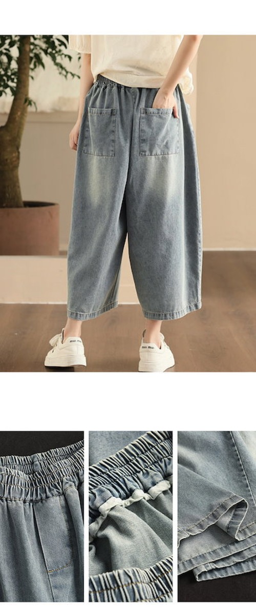 デニムパンツ レディース 7分丈 ワイド ワイドパンツ ワイド 大きいサイズ ゆったり 薄手 きれいめ ボトムス ウエストゴム 無地 柔らかい オフィス 美脚 通勤 可愛い 通勤 OL 体型カバー カ