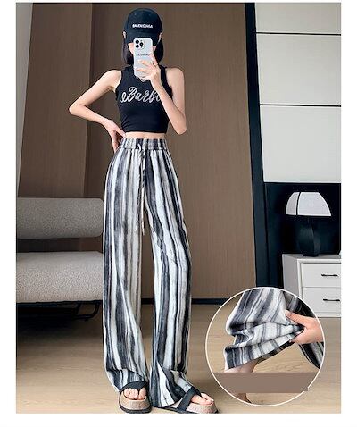 ワイドパンツ レディース 夏 きれいめ ストライプパンツ シフォン ストレートパンツ 薄手 リゾートパンツ きれいめ ウエストゴム 大きいサイズ ゆったり 体型カバー 低身長 涼しい 爽やか ひんやり