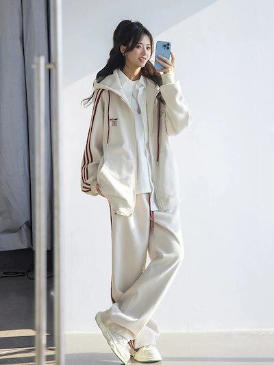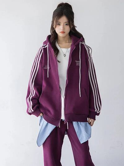 2024 秋冬 2点セット トップスパーカー フード付き チャック韓国羽織り ショート丈 フルパーカー ルーズ サイド上下ボトムス ストレート系冬 ゆったりサイズワイドシルエットリラックストラック