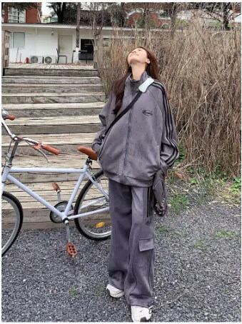 2024 春秋 2点セット トップス お出かけ 羽織り ショート丈 セットアップフルパーカーラウンドヘムルーズ サイド上下ボトムス ストレート系冬 ゆったりサイズワイドシルエットリラックストラック
