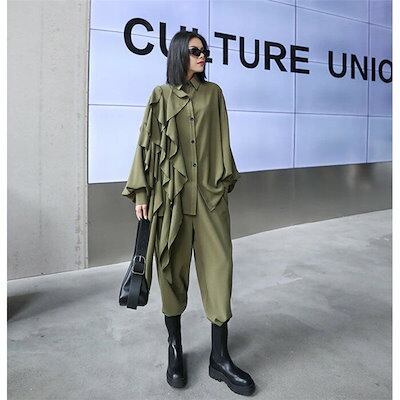 レディースきれいめセットアップ春秋長袖リーサイズグリーンブラック個性デザインアシメントリーブラウスワイドパンツ2点セットゆったり上品おしゃれ大きいサイズシンプルきれいめカジュアル