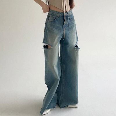 デニムパンツ デニム ジーンズ ジーパン ダメージ カッティング デニムパンツ レディース カジュアル 韓国ファッション ストリート ワイドパンツ サイドスリット