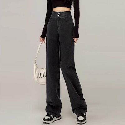 デニムパンツ デニム ワイドパンツ ストレート バッククロス ロングパンツ レディース 韓国ファッション 黒 サックス シンプル ハイウエスト 美脚 かわいい