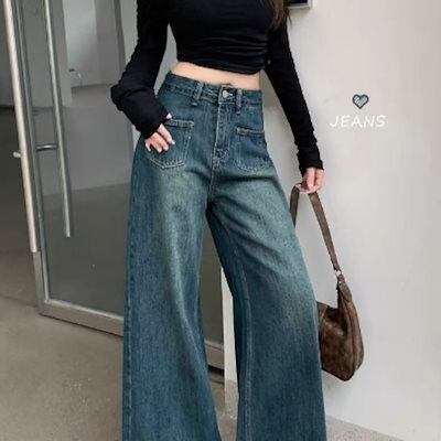 2024秋冬パンツ デニム ジーンズ ロング丈 ワイド ハイウエスト 美脚効果 脚長効果 細見え 秋 ブルー 青 おしゃれ かわいい 韓国ファッション レディース お出かけ