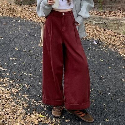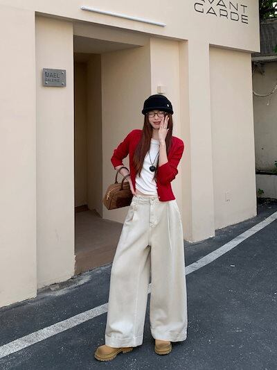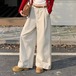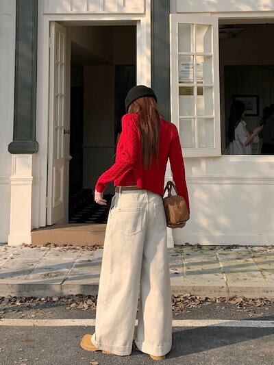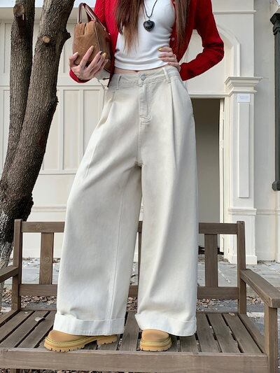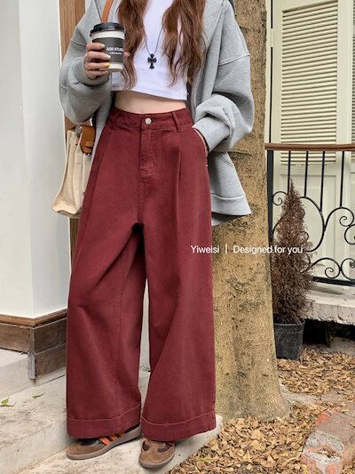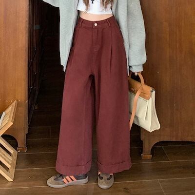 2024秋冬パンツ デニム ジーンズ ロング丈 ワイドレッグ ハイウエスト 美脚効果 脚長効果 細見え 秋 エンジ 赤 白 おしゃれ かわいい 韓国ファッション レディース お出かけ