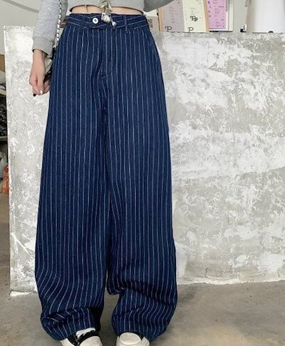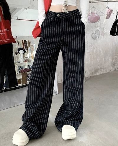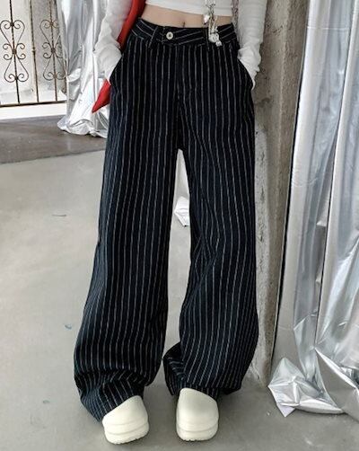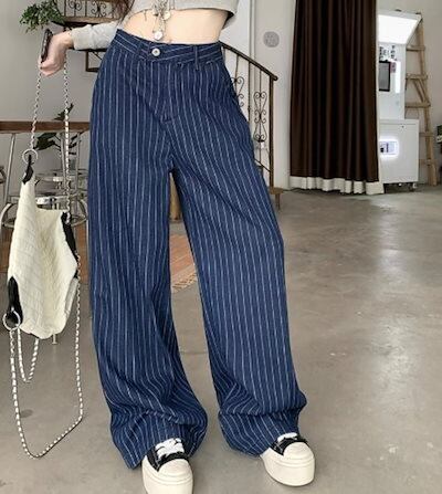 2024秋冬パンツ ロング丈 ワイド ストライプ ハイウエスト 美脚効果 脚長効果 細見え 秋 青 黒 おしゃれ かわいい 韓国ファッション レディース お出かけ