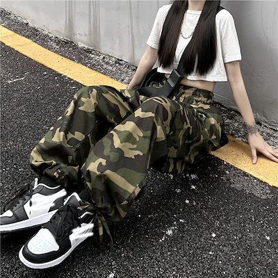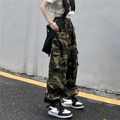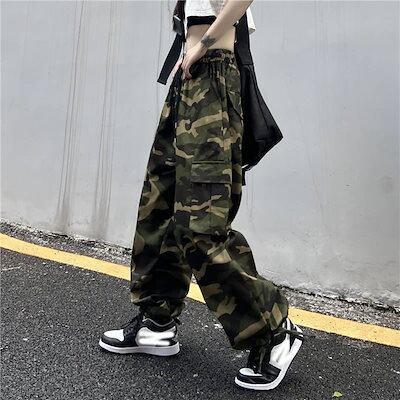 かっこいい!スラックスパンツワイドパンツシルエットで魅せる 超 ワイド 迷彩 カーゴパンツ ダボかわ ストリート メンズライク ワイルド カジュアル 裾ドローコード バギーパンツ 古着