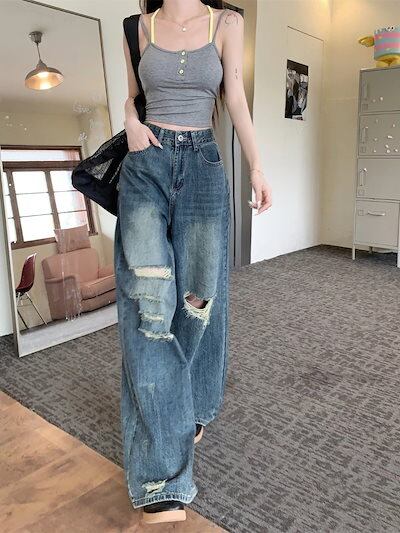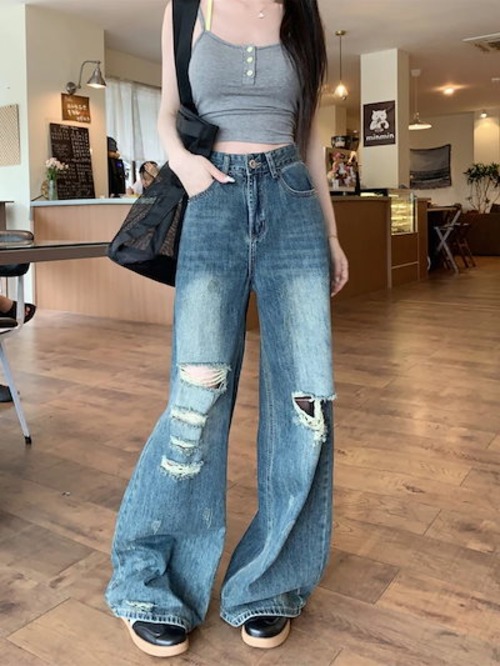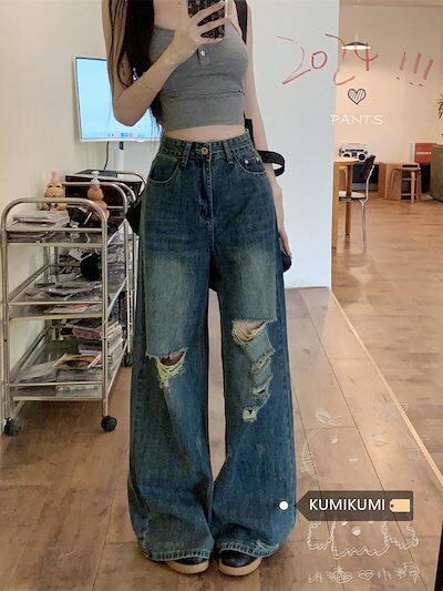 脚長効果!スキニーデニムパンツ レディース 破れたズボン おしゃれ 美脚 パンツ ワイドパンツ ロングパンツ 春夏秋 ズボン 韓国