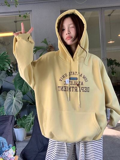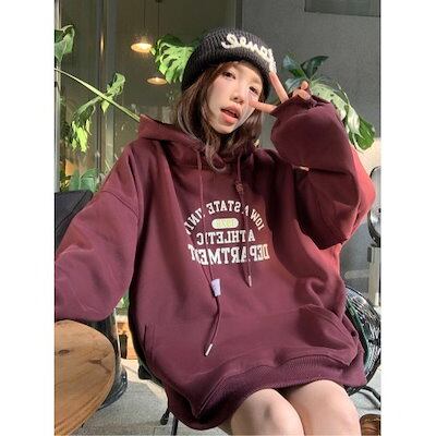 2024秋冬トップス 厚手裹起毛韓国風長袖レトロパーカーカジュアルルーズファッション系ゆったり大人っぽかわいいレディースフード付き羽織りサイズきれいめシルエットトレーナー 大学生通学高校