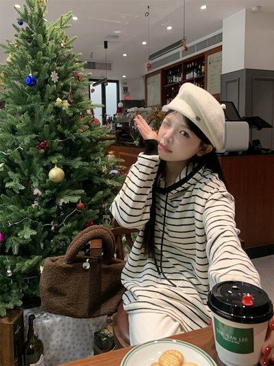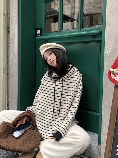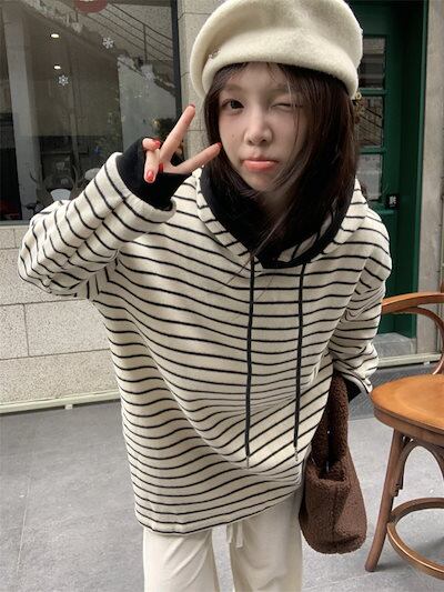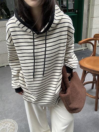 2024 秋冬トップスかわいいパーカー フード付き韓国風長袖ゆったり細見え白黒おしゃれレトロチャッシルエット甘め大人っぽ韓国フルサイズファッション系ルーズレディースサイドお出かけ学生通学トラック羽織り