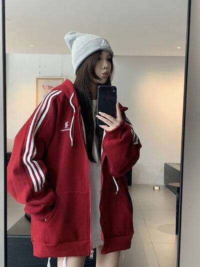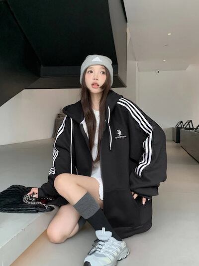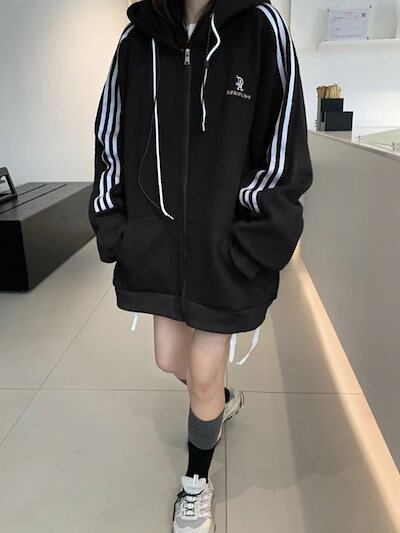2024 秋冬トップス パーカー 裹起毛 2type フード付き チャック長袖ストライプゆったり細見え白黒おしゃれかわいいガーリーキュート 甘め 韓国ファッション レディースサイドお出かけトラック