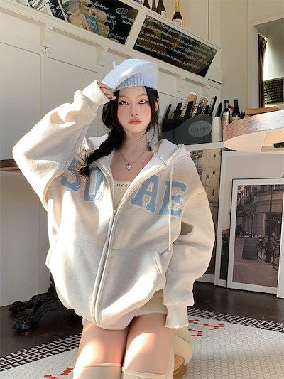2024秋冬トップス かわいい 厚手裹起毛 パーカー フード付き韓国風長袖ゆったり白黒おしゃれレトロチャックシルエット韓国フルサイズファッション系ルーズレディースサイドお出かけ学生通学トラック羽織り