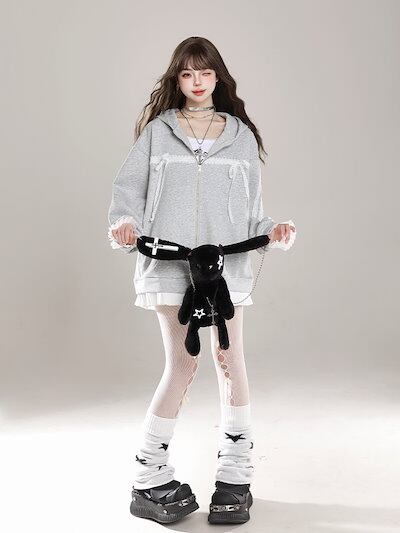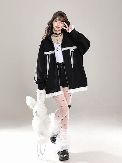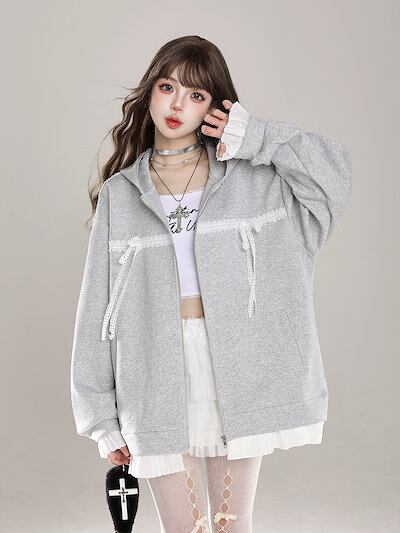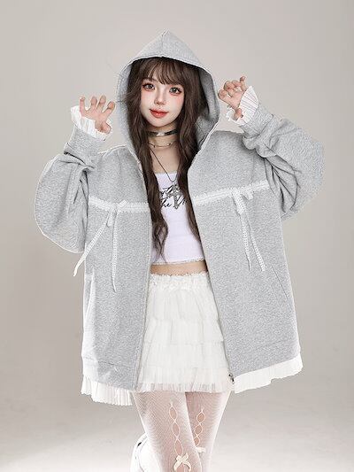 2024 秋冬トップスかわいいパーカー フード付き韓国風長袖ゆったり細見え白黒おしゃれレトロチャッシルエット甘め大人っぽ韓国フルサイズファッション系ルーズレディースサイドお出かけ学生通学トラック羽織る