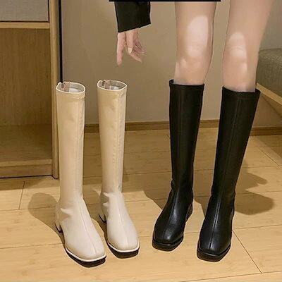 バブーシュ ヒ一ルパンプス 裏起毛 ボア スクエアトゥ 太めヒール 美脚 ヒール ロングブーツ ブーツ レディース ブーテスタイルアップ!ヒールパンプス