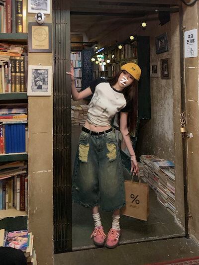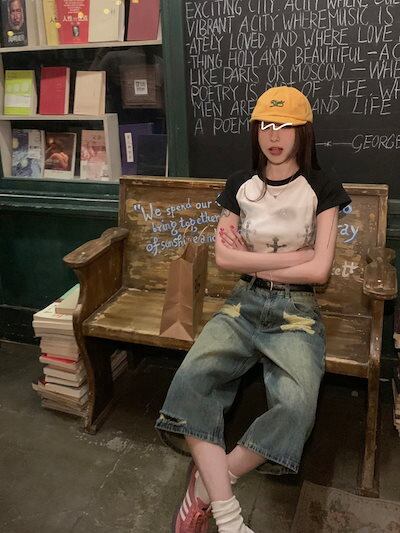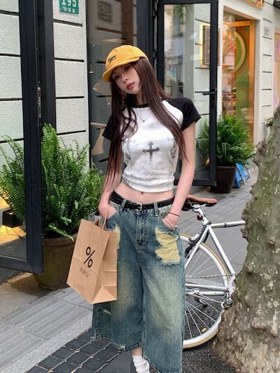 2024春夏パンツ デニム ジーンズ 7分丈 ダメージ加工 ウォッシュ加工 ワイド ハイウエスト 美脚効果 脚長効果 細見え 夏 おしゃれ かわいい 韓国ファッション レディース お出かけ