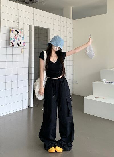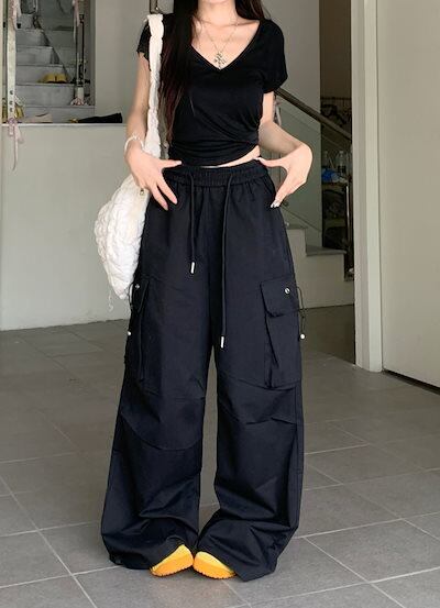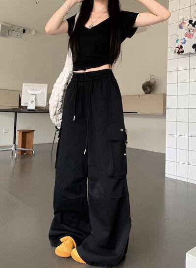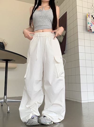 2024春夏パンツ ロング丈 ポケット ワイド ストレート ウエストゴム ハイウエスト 美脚効果 脚長効果 細見え 夏 白 黒 おしゃれ かわいい 韓国ファッション レディース お出かけ