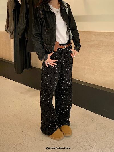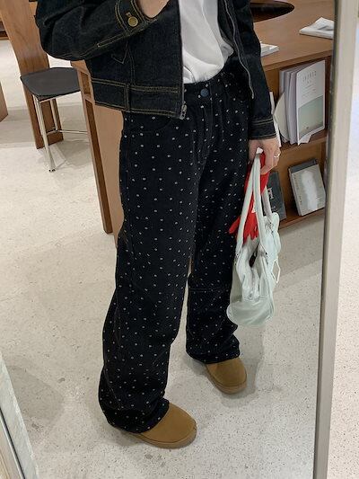 2025 初秋 デニムパンツ パンツ ワイド ストレート 花柄 ハイウエスト 脚長効果 美脚効果 細見え ブラック 黒 甘辛 かわいい おしゃれ カジュアル レディース お出かけ 韓国ファッション