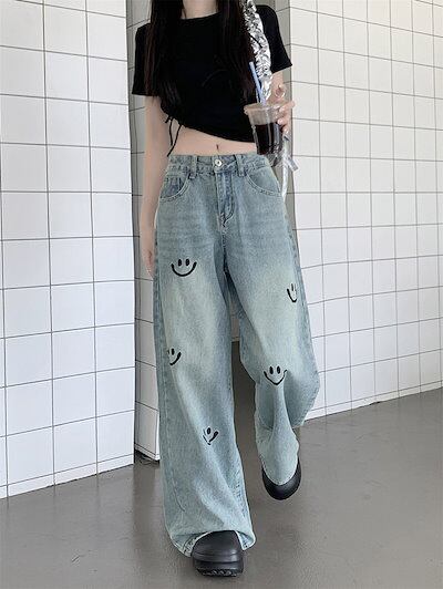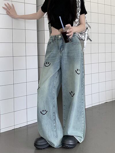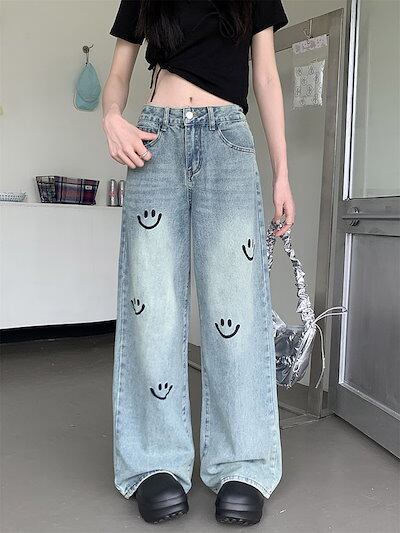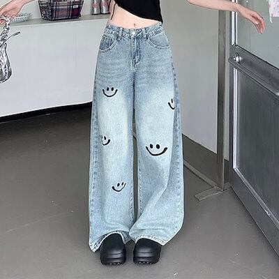 2024 春夏パンツ ロング丈 デニム ジーンズ ワイド ハイウエスト 美脚効果 脚長効果 細見え 夏 水色 ニコちゃん スマイル おしゃれ かわいい 韓国ファッション レディース お出かけ