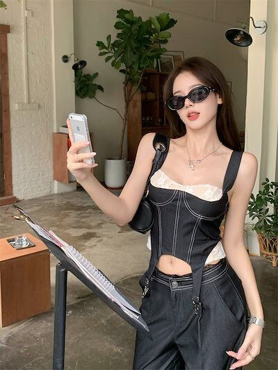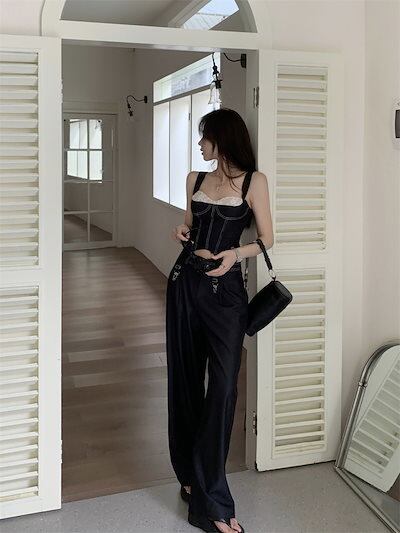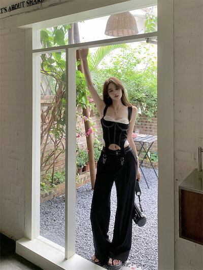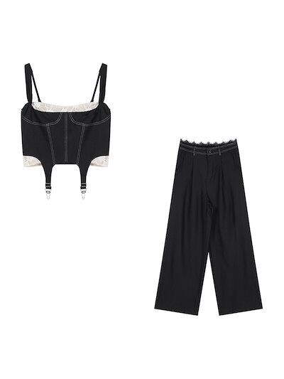 2024 夏ショート丈 キャミソールブラウス ロング丈 パンツ 2点セットスクエアネック 韓国半袖 レッグボトムス トップス 大人可愛いファッションレディースフェミニンカジュアル上下ハイウエスト