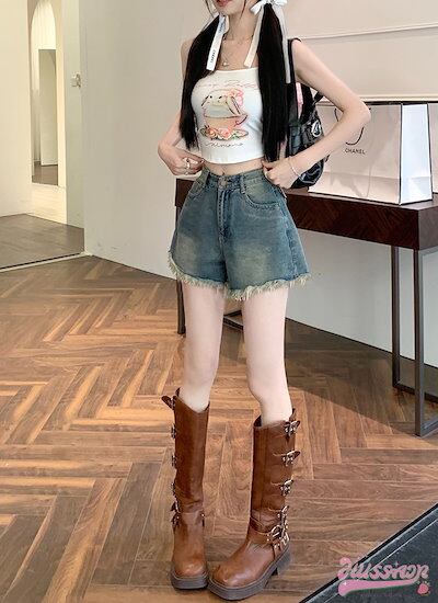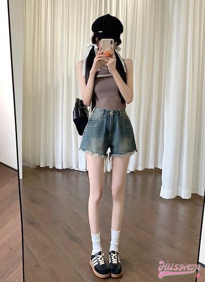 2024 春夏パンツ デニム ジーンズ ショート丈 ハイウエスト 脚長効果 美脚効果 細見え カジュアル かわいい おしゃれ 春 韓国ファッション レディース お出かけ