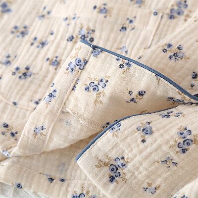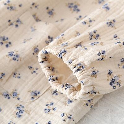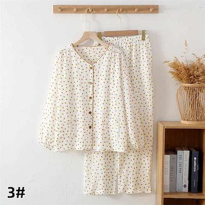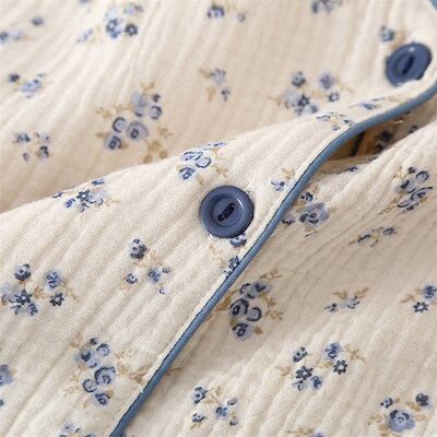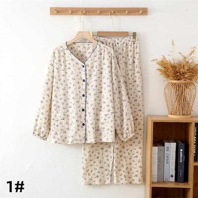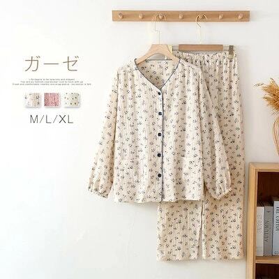 ガーゼ パジャマ レディース ルームウェア パンツ 春 秋 ガーゼコットン vネック 総柄 花柄 配色 春秋 長袖 ダブルガーゼ 2重ガーゼ 綿 部屋着 セットアップ 2点セット ナイト 寝間着 寝巻