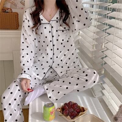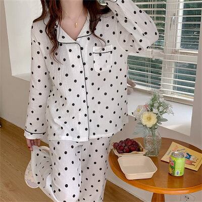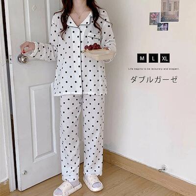 ガーゼ パジャマ レディース ルームウェア パンツ 春 秋 ガーゼコットン vネック ドット 水玉 配色 春秋 長袖 ダブルガーゼ 2重ガーゼ 綿 部屋着 セットアップ 2点セット ナイト 寝間着 寝