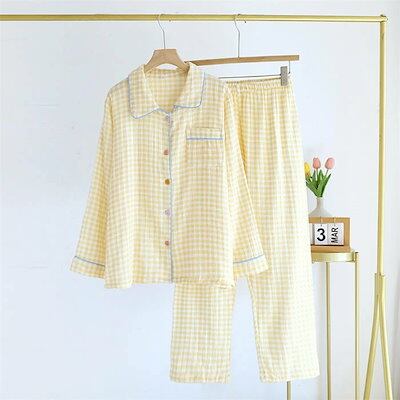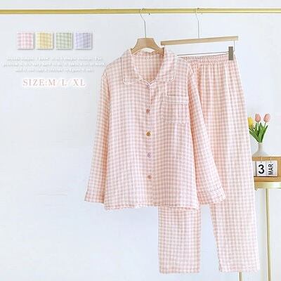 ガーゼ パジャマ レディース ルームウェア パンツ コットン 長袖 春 秋 ガーゼコットン 可愛い チェック 春秋 ダブルガーゼ 2重ガーゼ 綿 部屋着 セットアップ 2点セット ナイト 寝間着 寝巻
