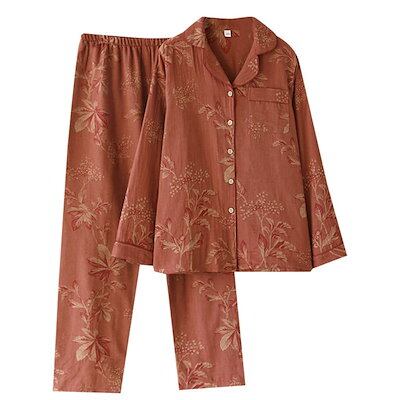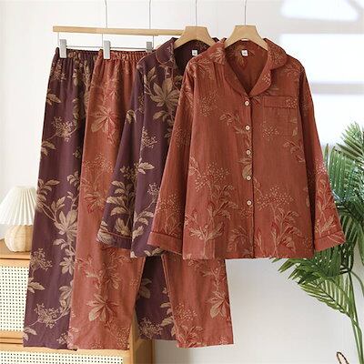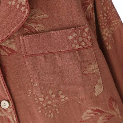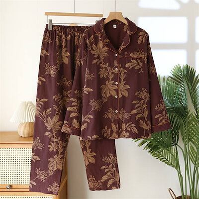 ガーゼ パジャマ レディース ルームウェア パンツ 綿 春 秋 ガーゼコットン チャイナ 花柄 配色 春秋 長袖 ダブルガーゼ 2重ガーゼ 部屋着 セットアップ 2点セット ナイト 寝間着 寝巻き 上