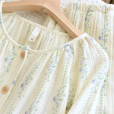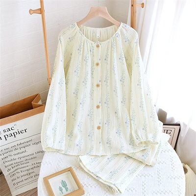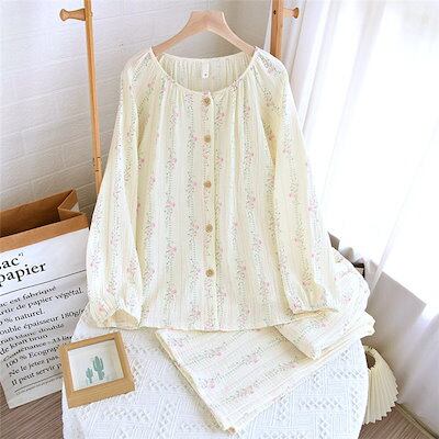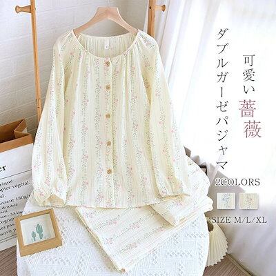 薔薇 ガーゼ パジャマ レディース 花柄 総柄 ルームウェア 春 秋 冬 長袖 チェック 部屋着 セットアップ 2点セット 寝間着 寝巻き 上下セット 前開き 大きいサイズ 大人 ノーカラー ダブルガ